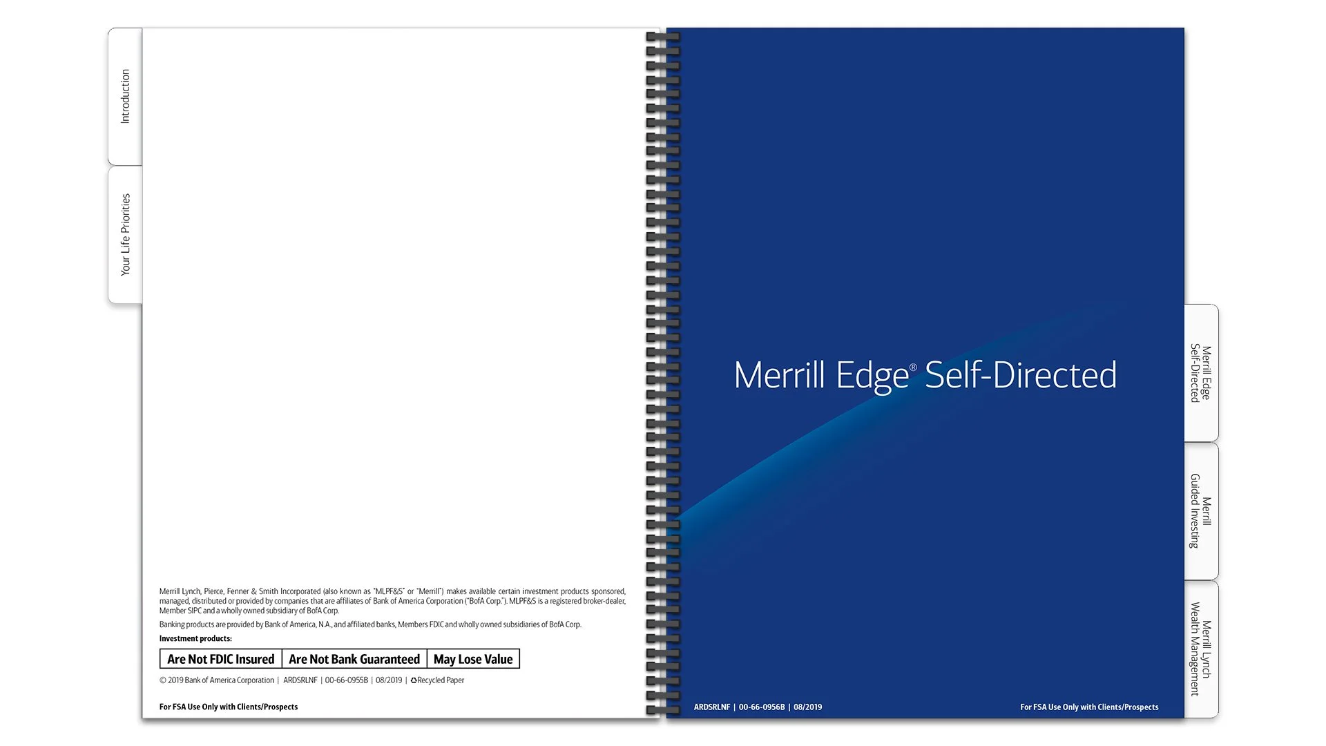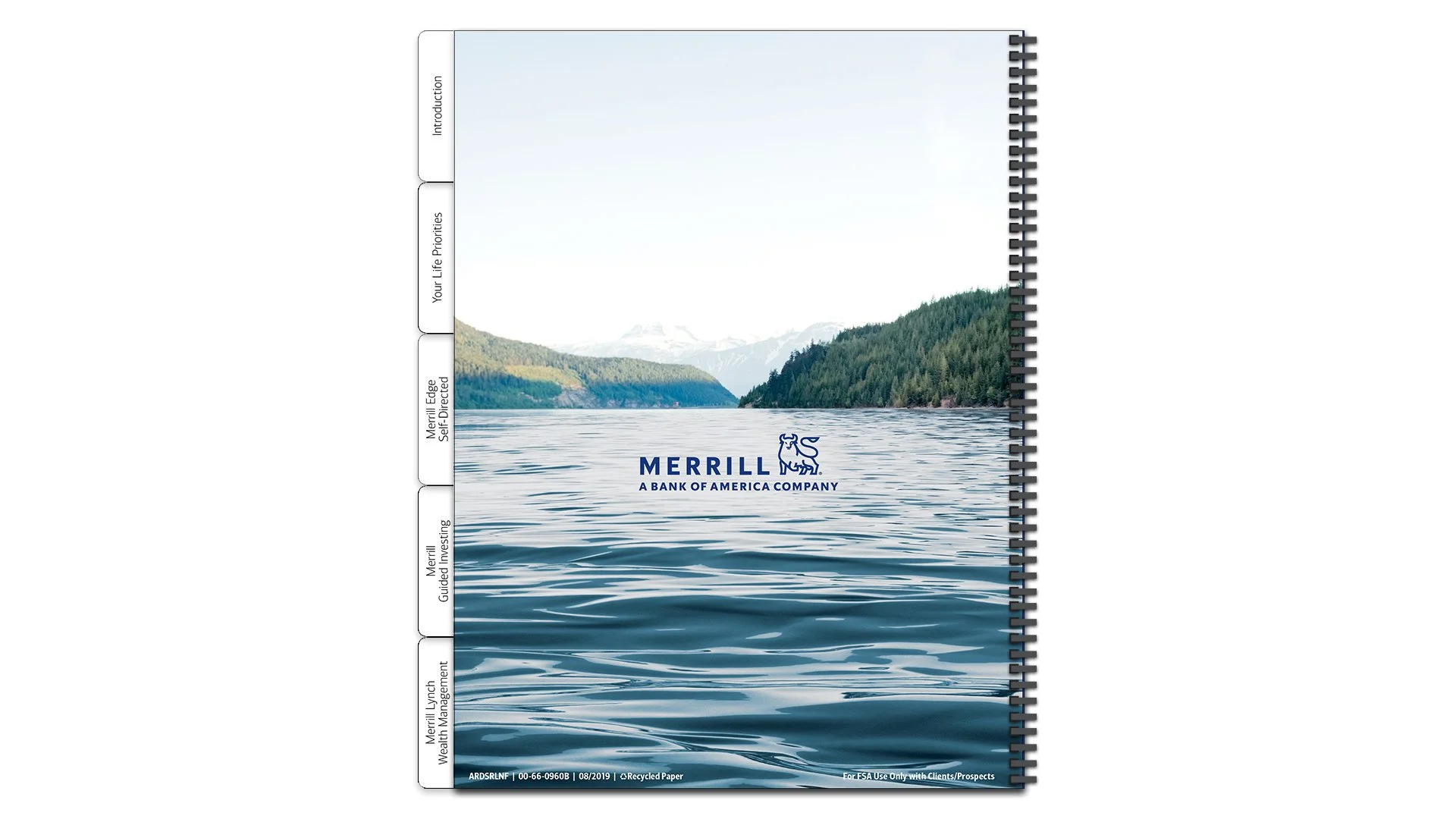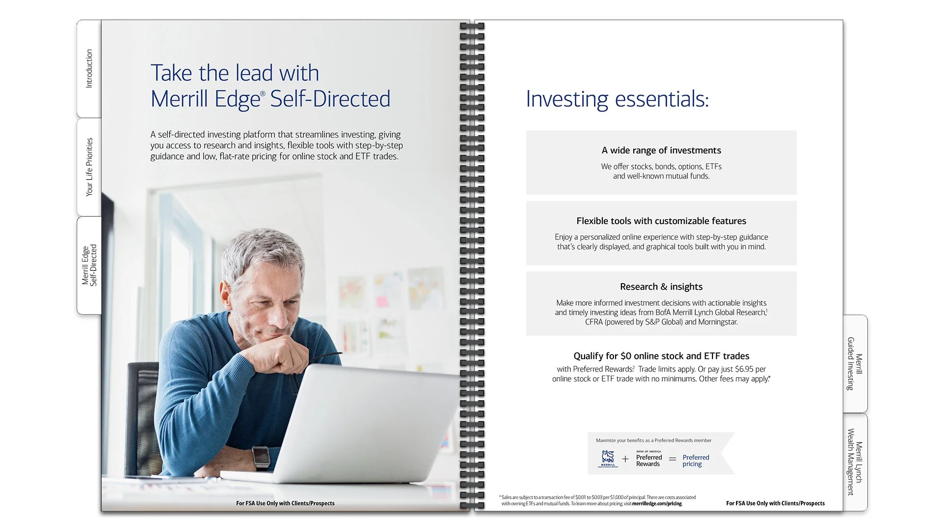 The Merrill Associate Tool is a multipage binder that associates in the financial center use to help assist in selling products and services to potential or existing clients. Of course, it’s not that easy when you’re talking about investing products. As a tool, it needed to contain enough information to inform the customer, but not so much that the associate didn’t have anything to add. The tabs helped the associate easy and quickly find the section they needed, and the content was designed to flow easily and be easy to read.